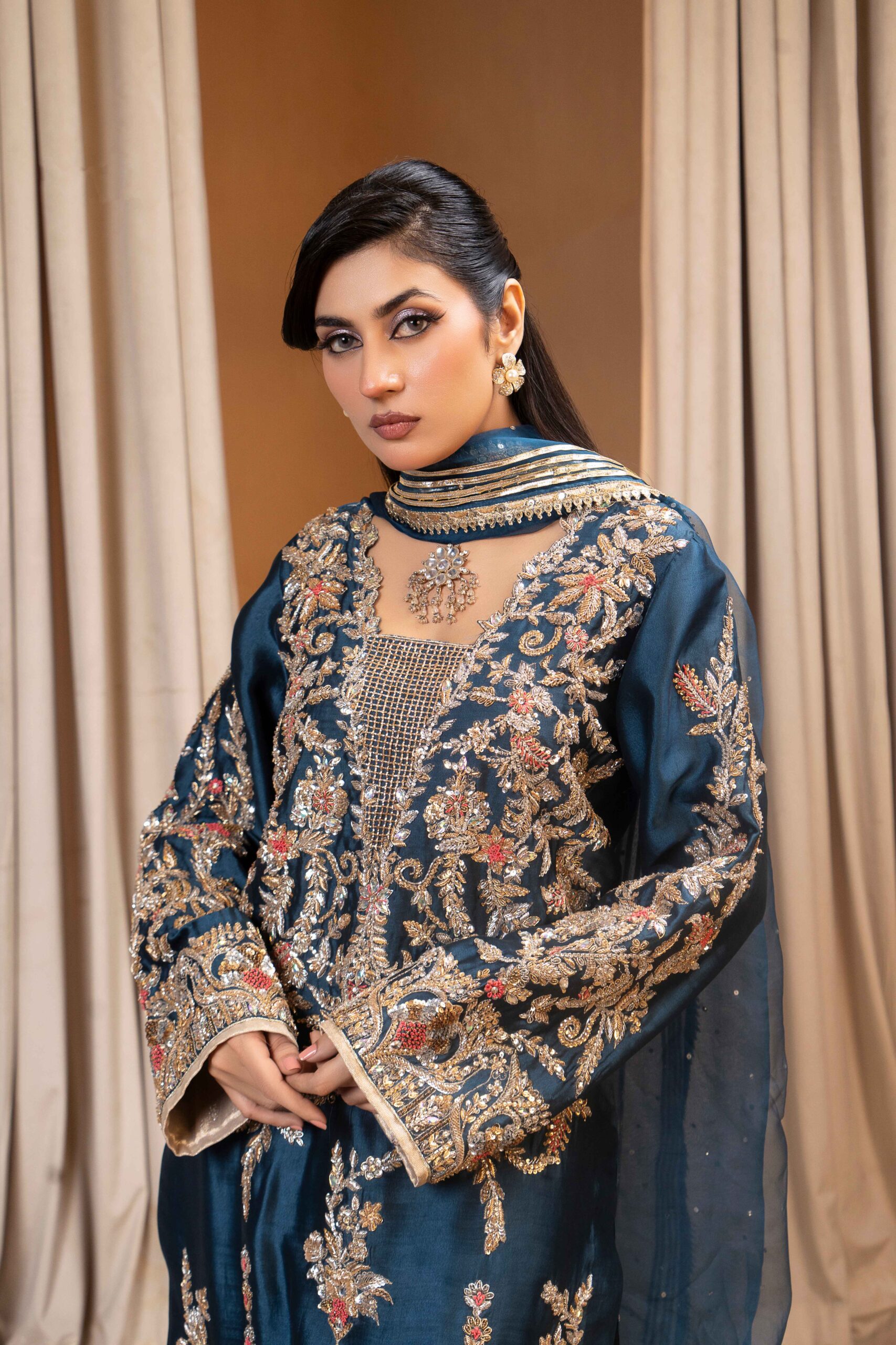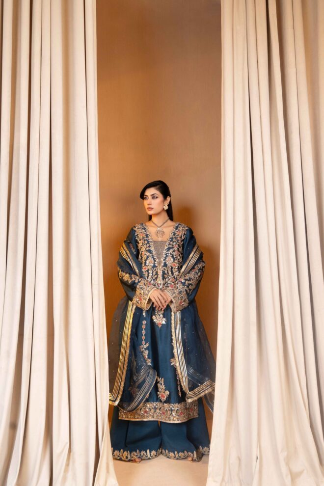 This striking navy blue matching separate has intricate embellishment of gold korra and dabka and Coral rasham,and gold buggle beads on shirt, sleeves and embroided pants. It is paired with navy blue Lappa and lace dupatta with sequins to complete the look.